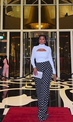 She wore a polka-dot trousers paired with a subtle, cleavage-revealing white top.